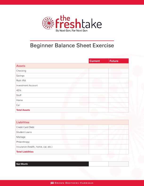 During or immediately after college, your balance sheet may have more liabilities than assets (e.g., student loans), which is why it can be useful to also create an aspirational balance sheet for 10 or 20 years from now. Along with helping you plan for the future, a personal balance sheet expands on some core concepts of investing: asset allocation and risk.